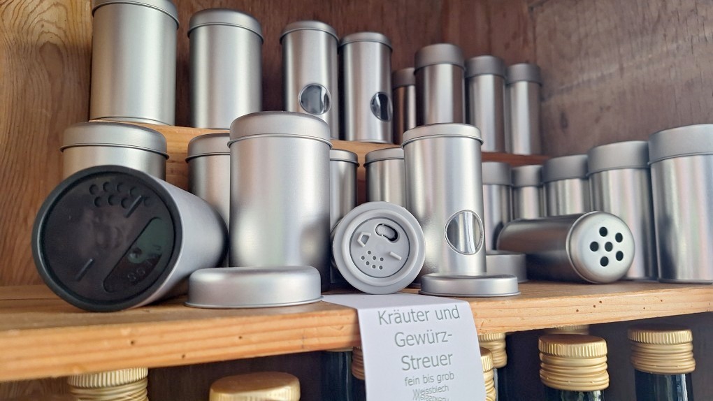 | 110011 | Kräuter/Gewürzdose -auch für grobes Salz -6 Loch Durchm. 45mm/Höhe 85mm (Weissblechdose) | 1 Stück | 1,50 € | Abbildungen siehe unten |