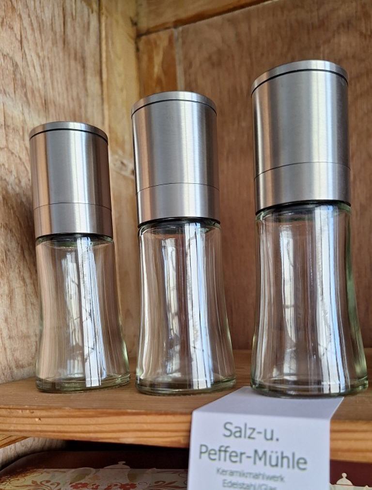 | 110036 | Gewürz-/Salz-/Pfeffermühle mit Keramikmahlwerk Glas/Edelstahl-Kombi- Durchm. 49mm/Höhe 135mm | 1 Stück | 9,00 € | Abbildungen siehe unten |