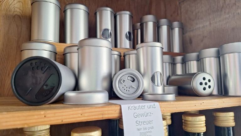 | 110012 | Kräuter/Gewürzdose mit Sichtfenster -auch für Salz - Mit 3 verschiedenen Öffnungen-Verstellbar- Durchm. 45mm/Höhe 90mm (Weissblechdose) | 1 Stück | 2,00 € | Abbildungen siehe unten |